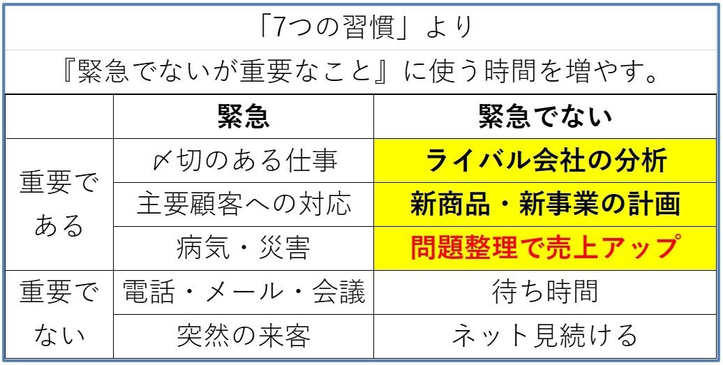 この中の第3の習慣に「『緊急でないが重要なこと』に使う時間を増やす」というものがあります。経営にとって重要なことに使う時間を増やしていきましょう、ということです。